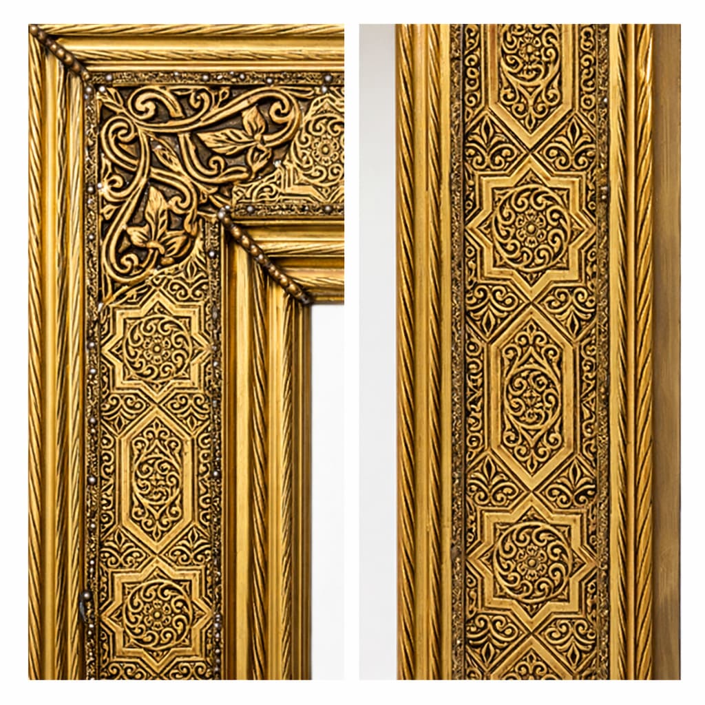 Espelho árabe de estilo moderno, feito de alpaca dourada, artesanal. Design Ourika, inspirado na geometria de Al-Andalus.