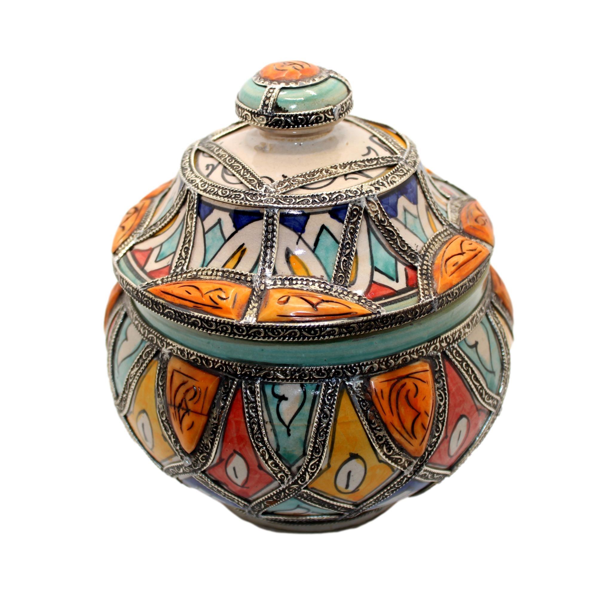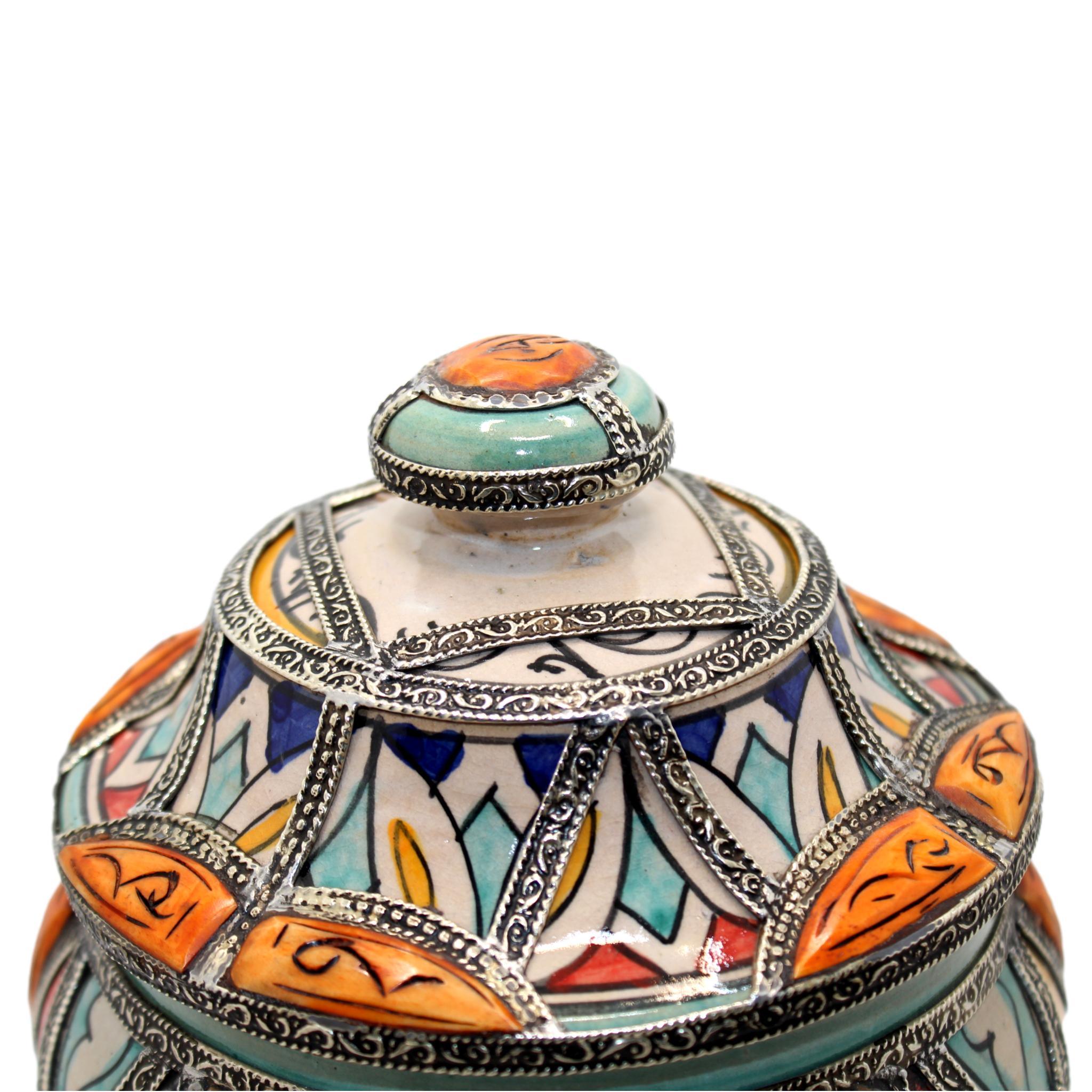 Doceira árabe de cerâmica pintada à mão, com um estilo vibrante e colorido, finalizada com pedaços de osso natural e padrões típicos do sul de Marrocos. Esta doceira árabe é ideal como peça central, para decorar uma sala colocando-a em uma prateleira ou em um espaço onde se destaque, pois é repleta de elementos que a tornam única e singular.