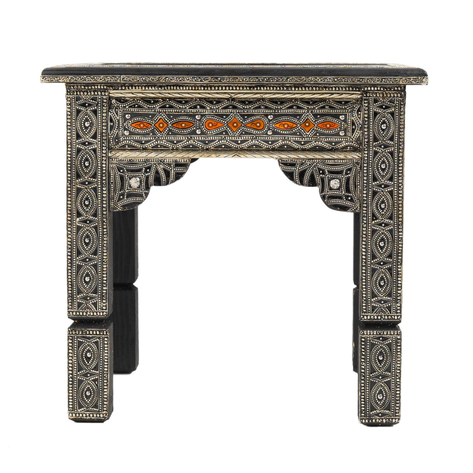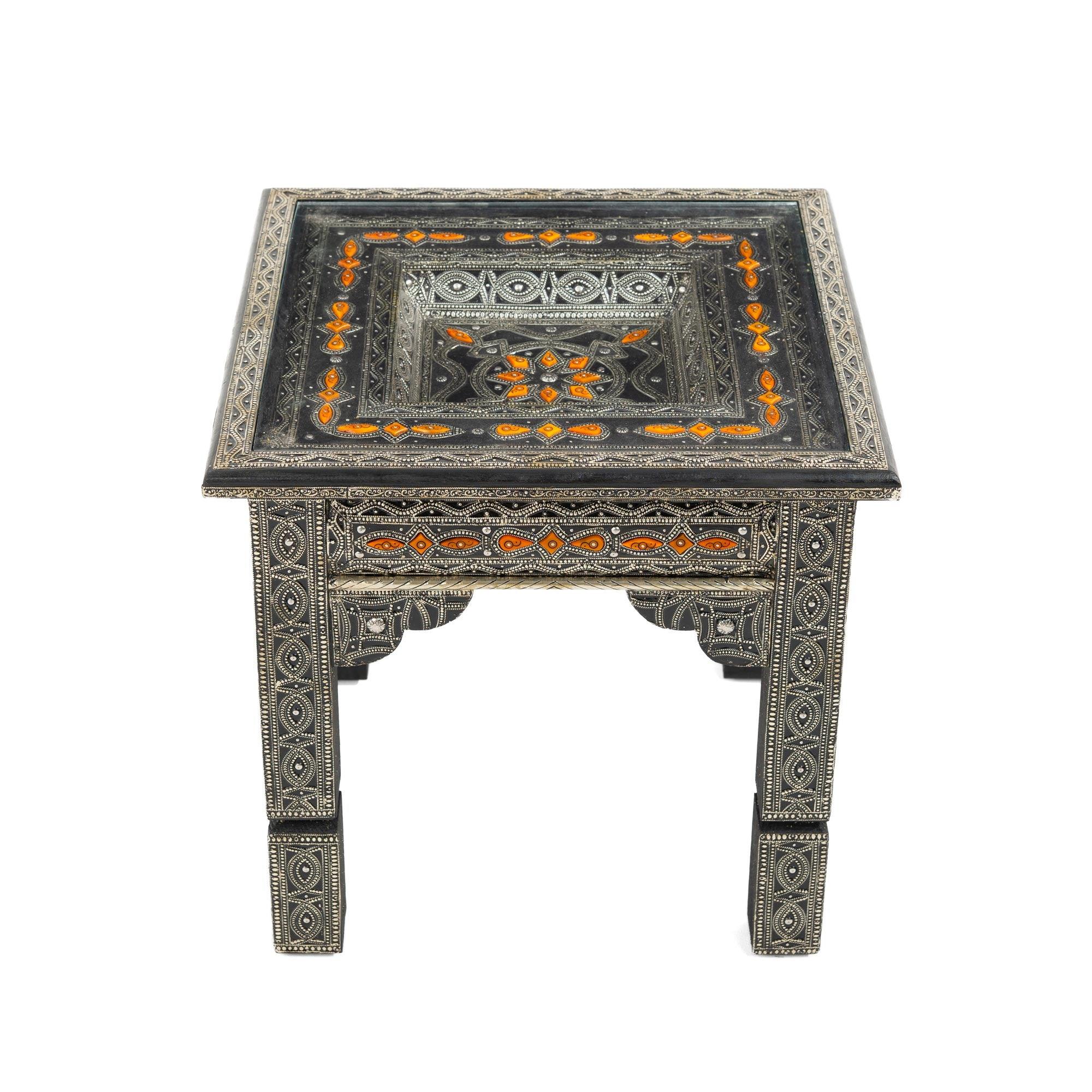 Mesa marroquina feita de madeira folheada a alpaca e osso de laranjeira. Com seu design quadrado e robusto, esta mesa é inteiramente feita à mão em Marrakech, no sul de Marrocos. Os ossos são cortados à mão e incrustados na superfície folheada a alpaca. Este artesanato tradicional marroquino faz dela uma peça marcante e representativa da decoração marroquina.