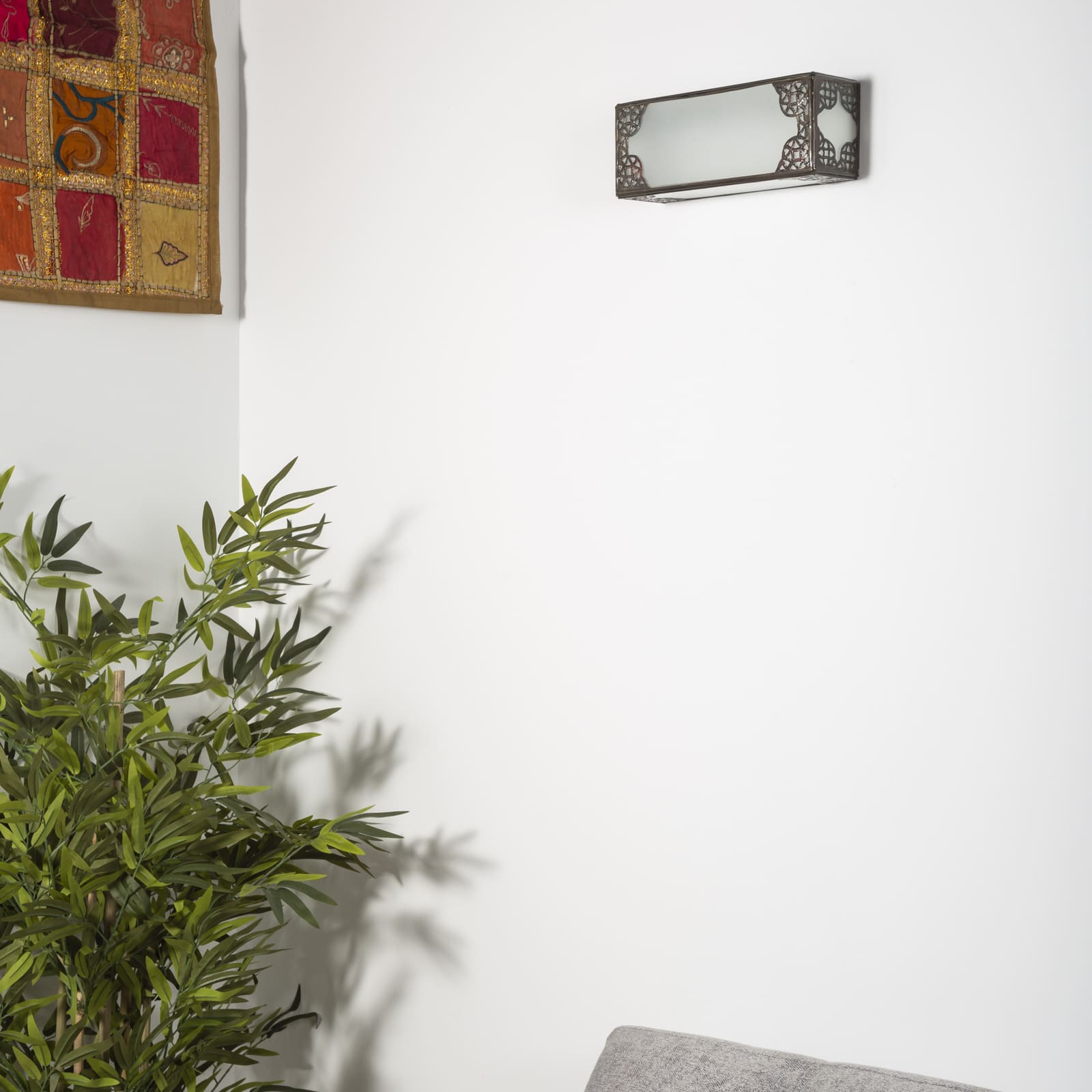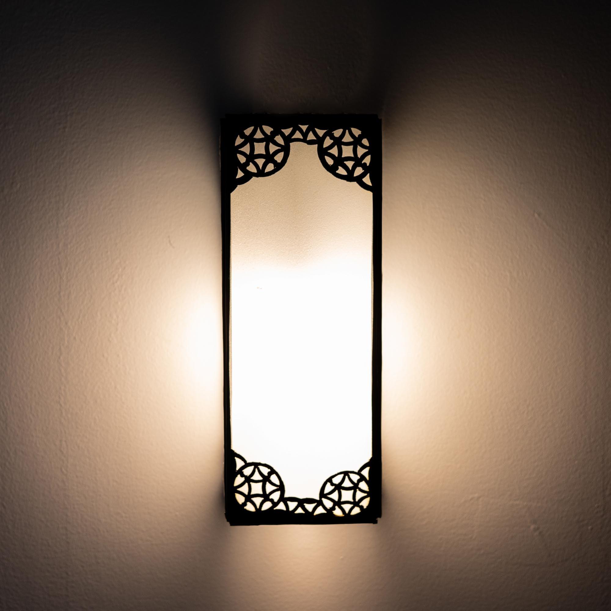 Aplique marroquí de forja y cristal blanco. Diseño actual para estilos decorativos árabes modernos y orientales. El aplique está fabricado en cristal translúcido de color blanco y forja calada tallada a mano por los artesanos de Marruecos.