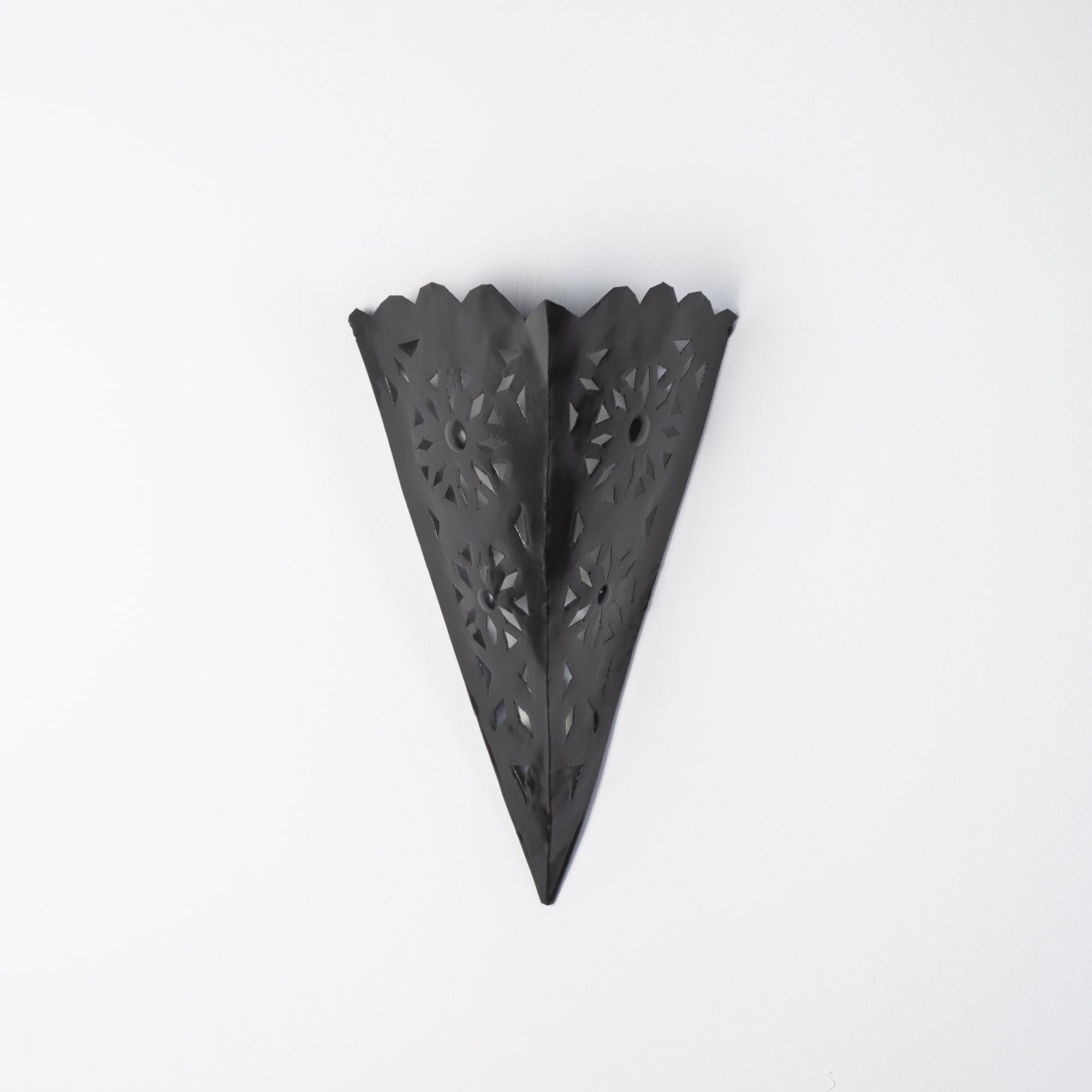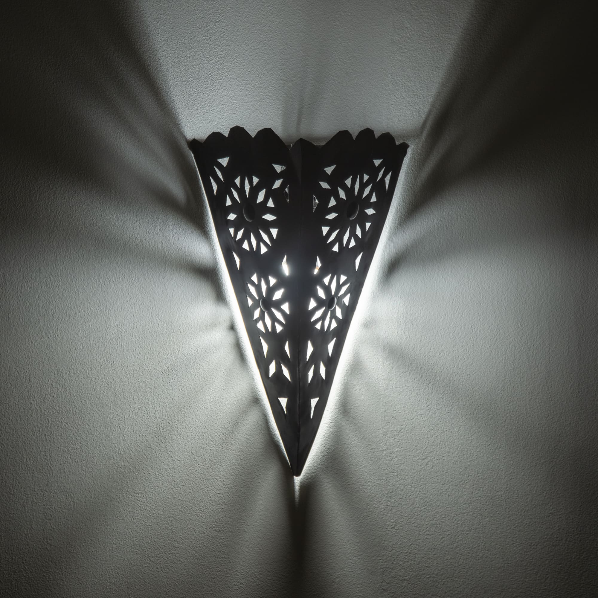 Arandela de parede em ferro forjado estilo marroquino, com design piramidal. Ideal para iluminar seu pátio ou terraço, esta arandela robusta e durável para áreas externas é fácil de manter. Se mantida ao ar livre, basta aplicar uma camada de verniz periodicamente para mantê-la com a melhor aparência.