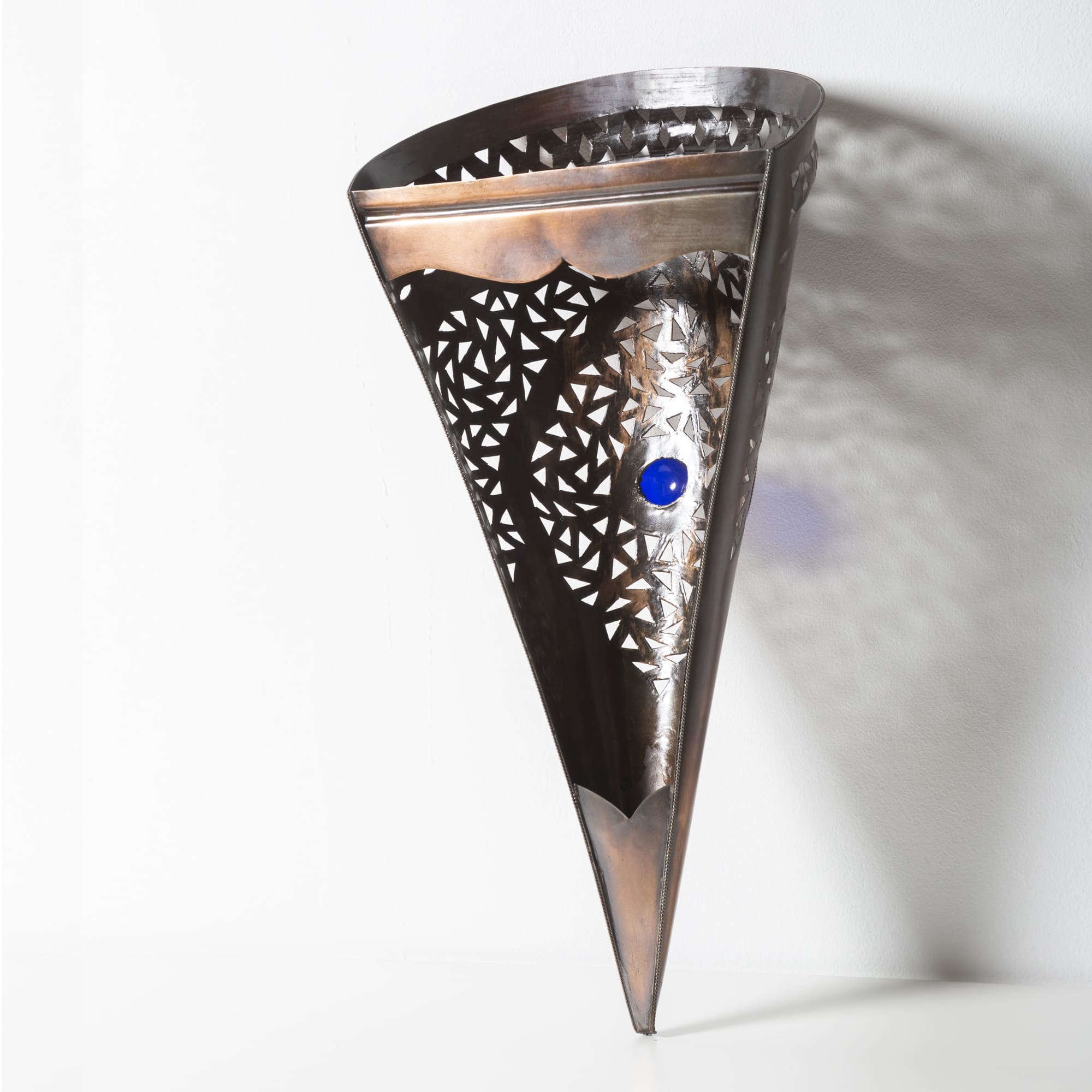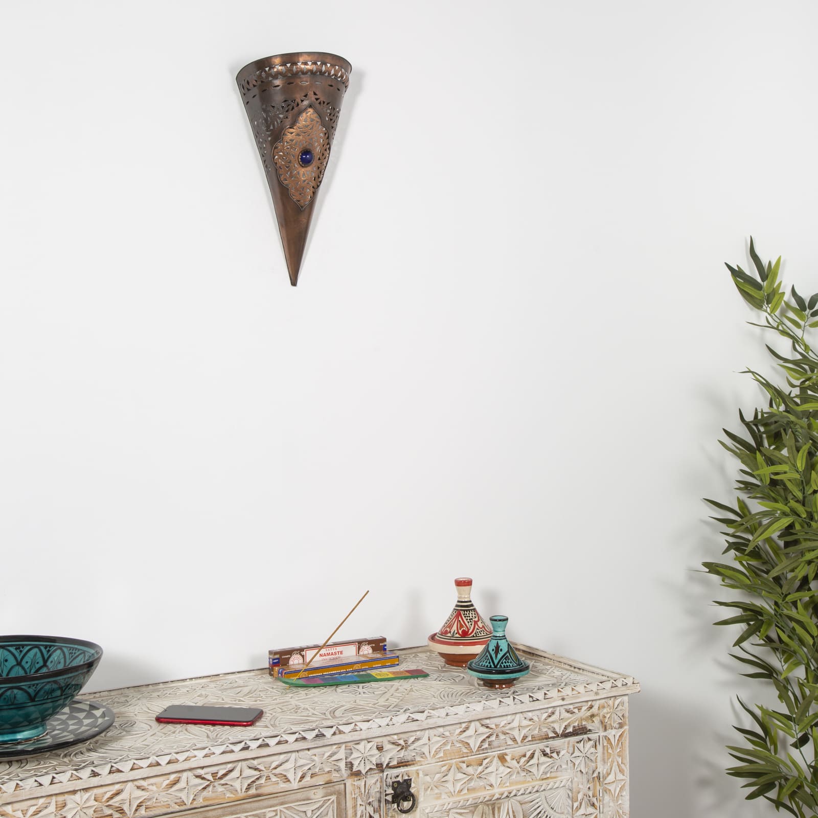 Aplique de parede artesanal em cobre e latão dourado, no estilo árabe. Incrustação decorativa de pedra no centro.