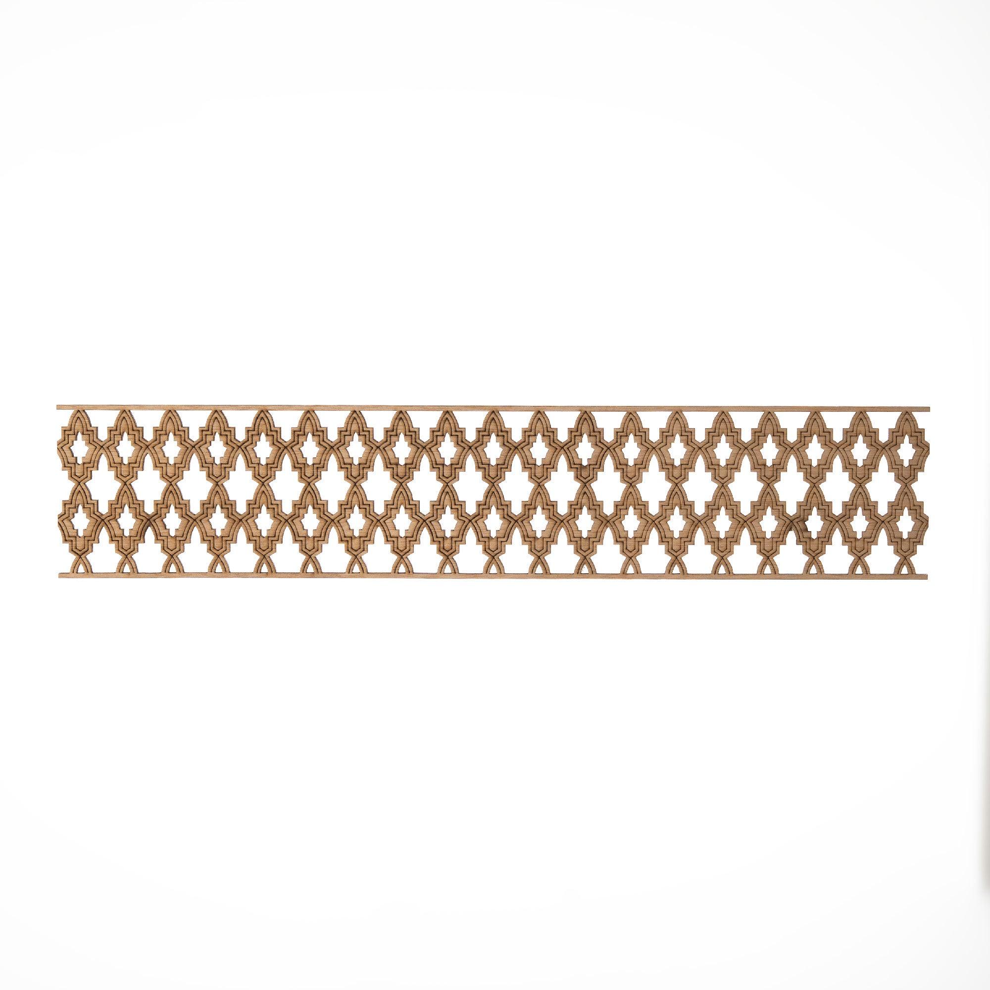 Painel decorativo em madeira laminada de 4 mm, cortado a laser, com desenhos geométricos em estilo árabe, mourisco ou andaluz. Ideal para decorar qualquer peça de mobiliário — mesas, cadeiras, armários — em estilo árabe, mourisco ou andaluz, ou para decorar bordas, paredes, rodapés, tetos, portas, etc.