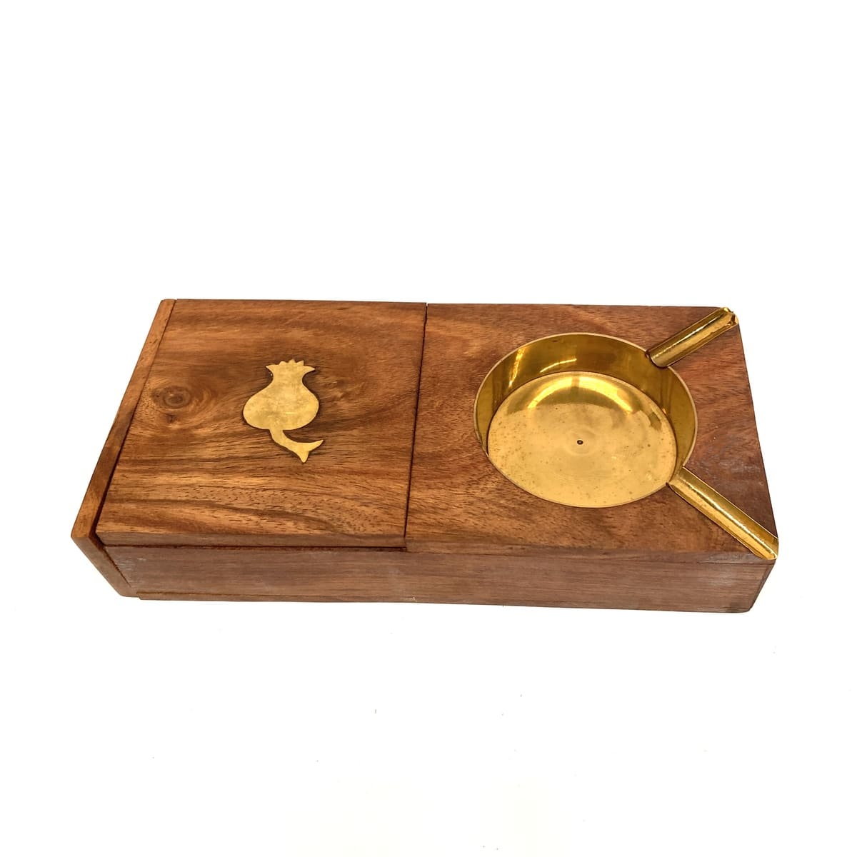 Um cinzeiro de madeira muito clássico, com suportes e reservatório de cinzas em acabamento bronze dourado.