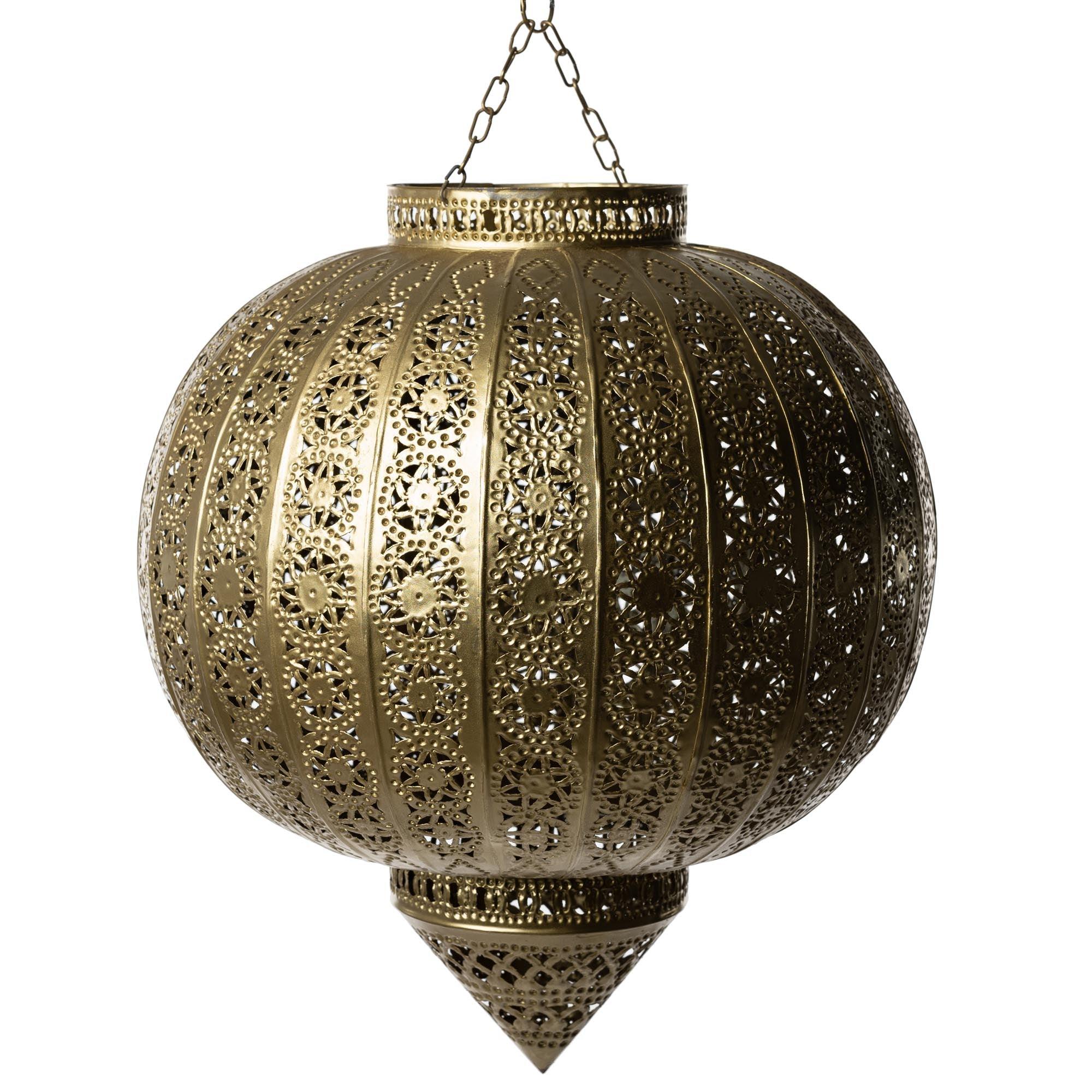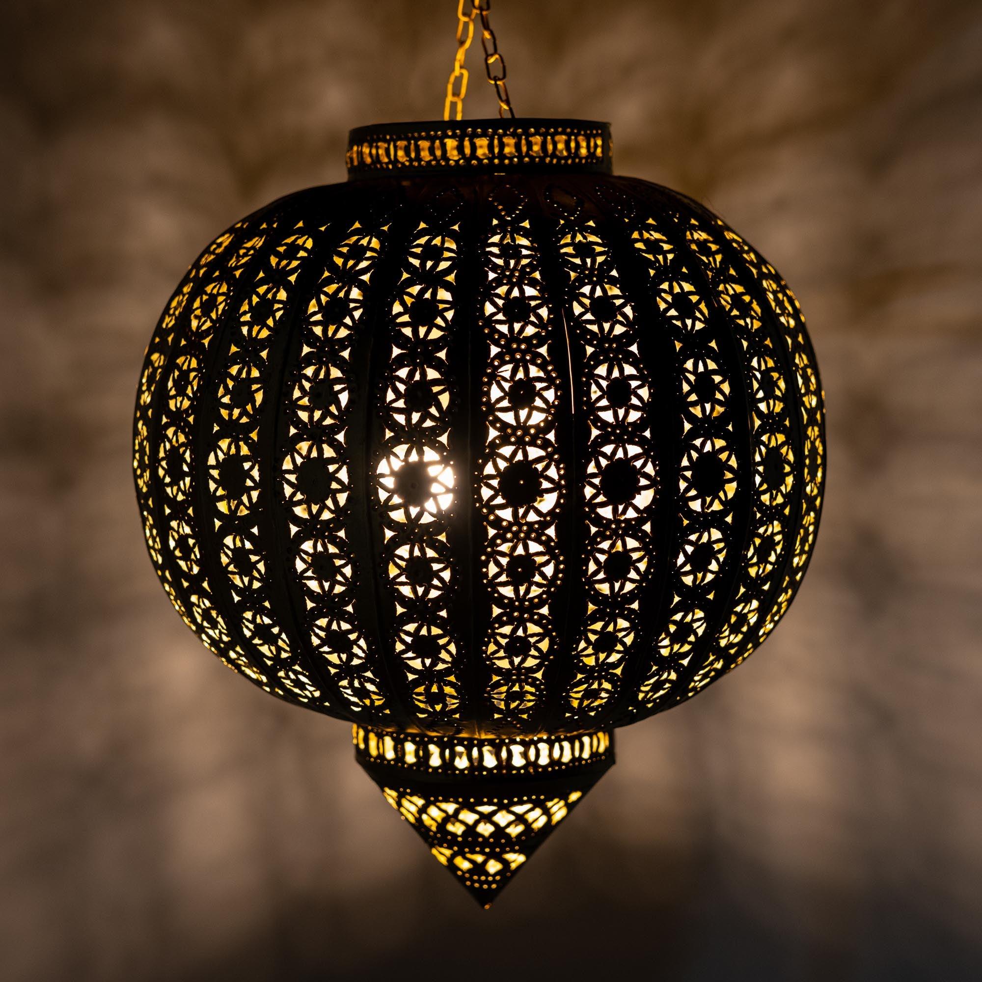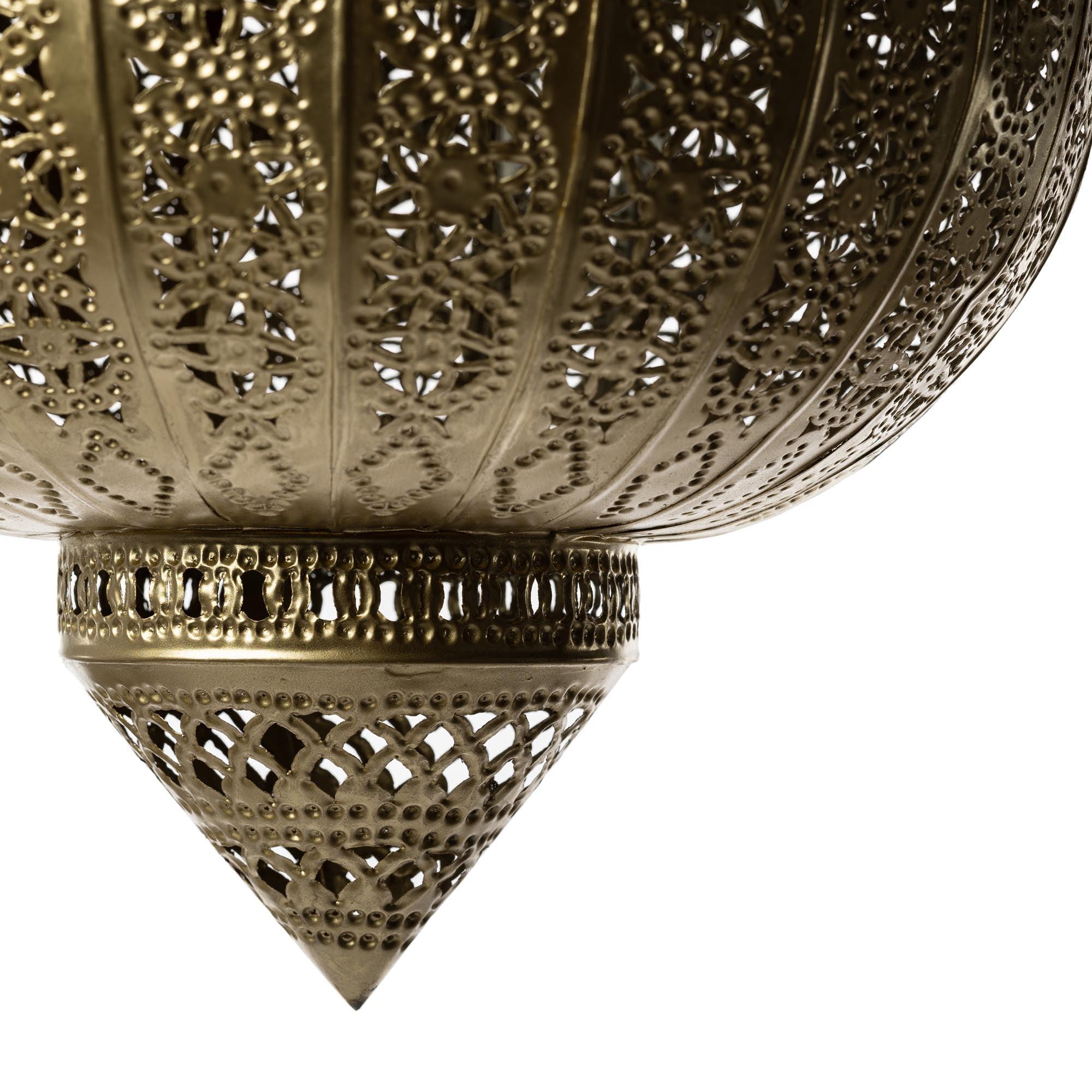 Luminária de teto marroquina, modelo esfera dourada vazada. Feita de chapa metálica dourada pintada à mão, esta luminária marroquina é ideal para pendurar no teto de um quarto, em jardins ou terraços. Belos mosaicos de luz árabes se estendem em todas as direções através do ferro forjado vazado. As luminárias marroquinas se caracterizam pelas formas marcantes que projetam nas paredes e tetos de uma casa.