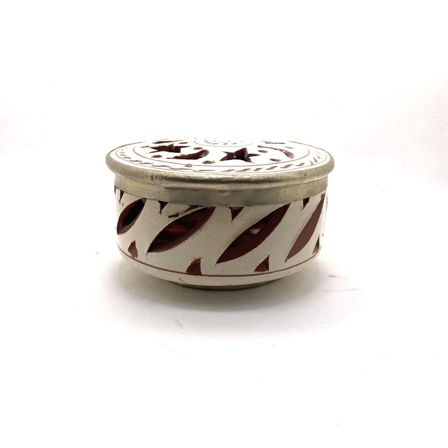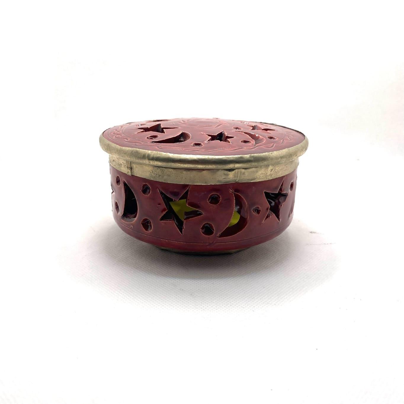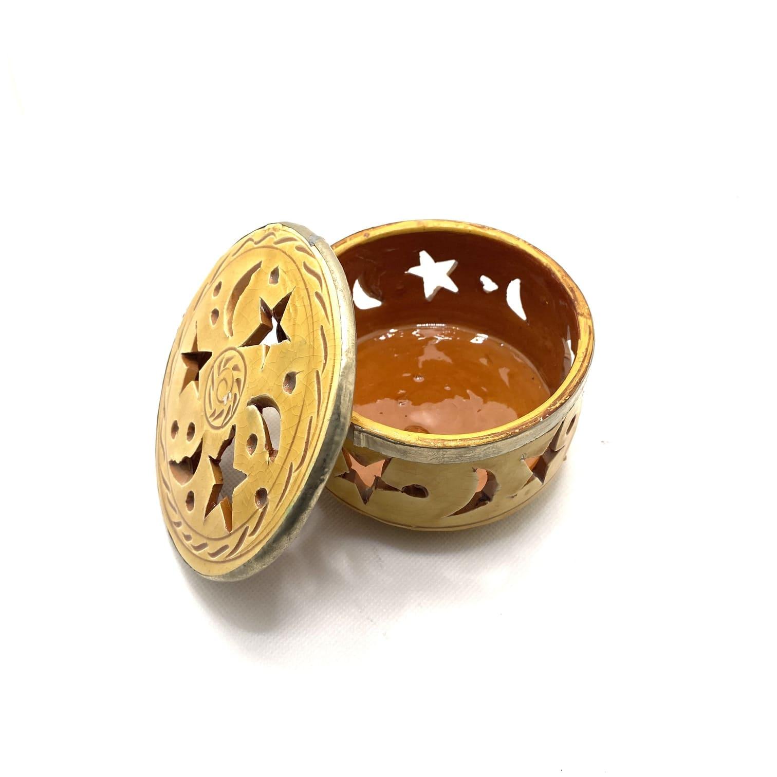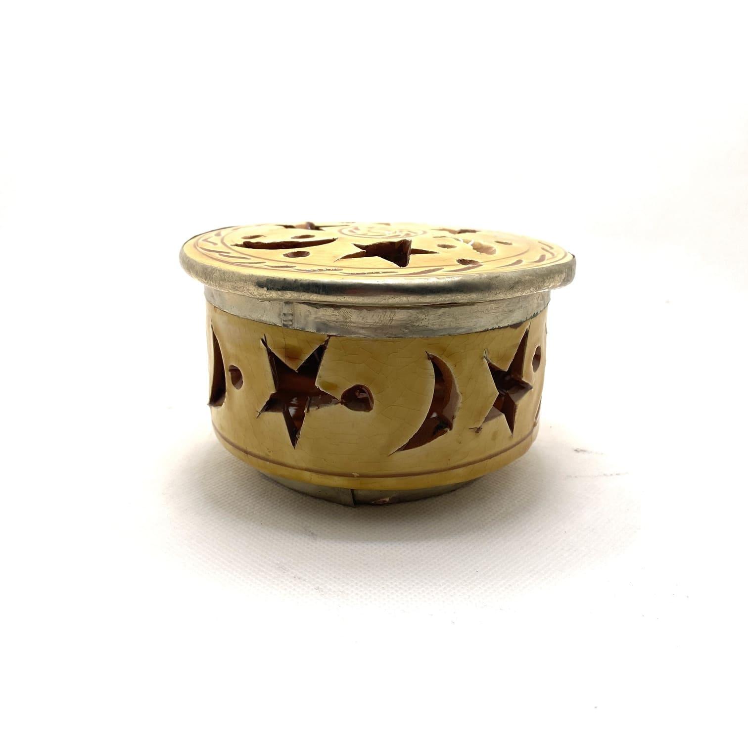Incensário marroquino feito de cerâmica e gravado à mão com desenhos de estrelas e luas. Ideal para queimar nossos incensos de grãos naturais e incensos em cone.