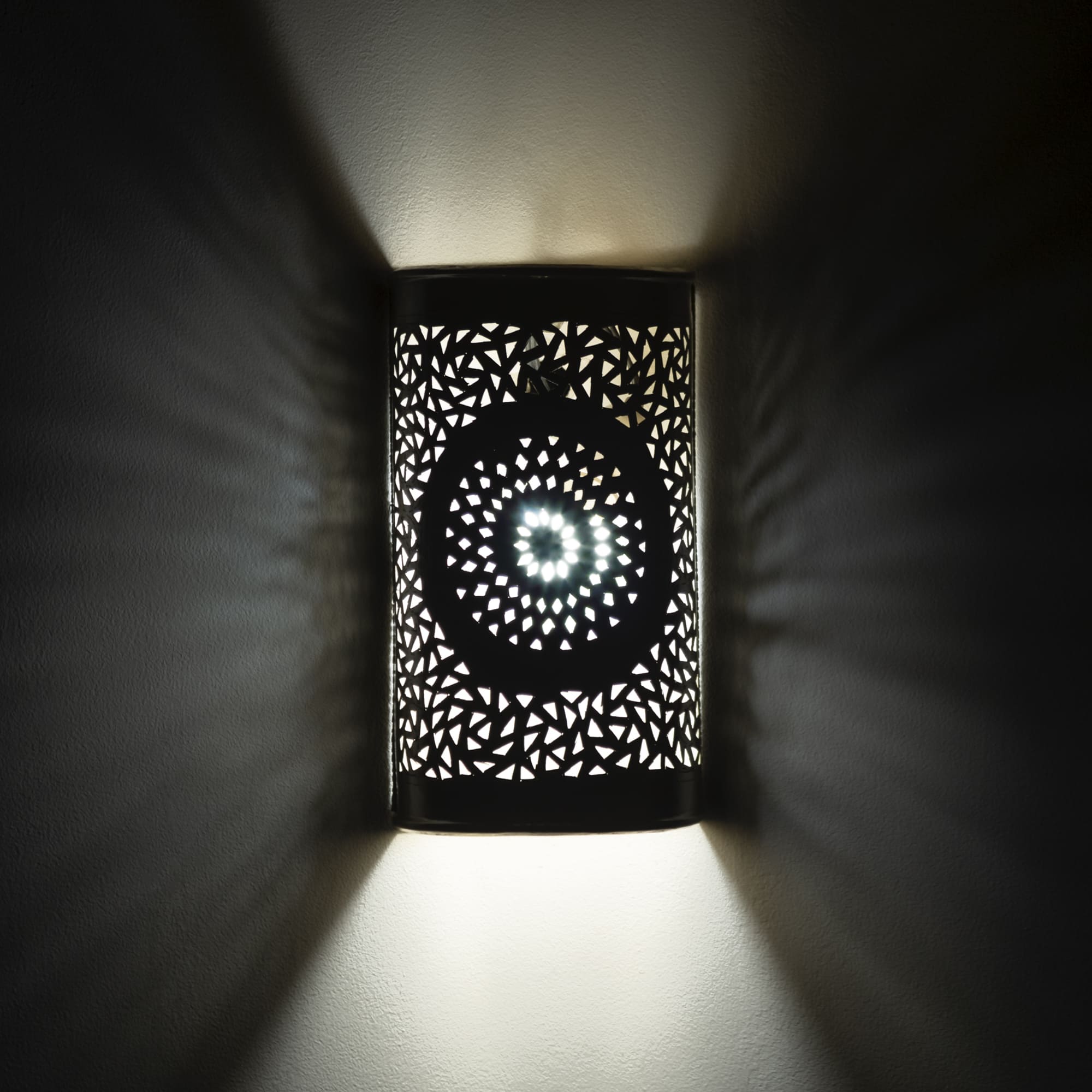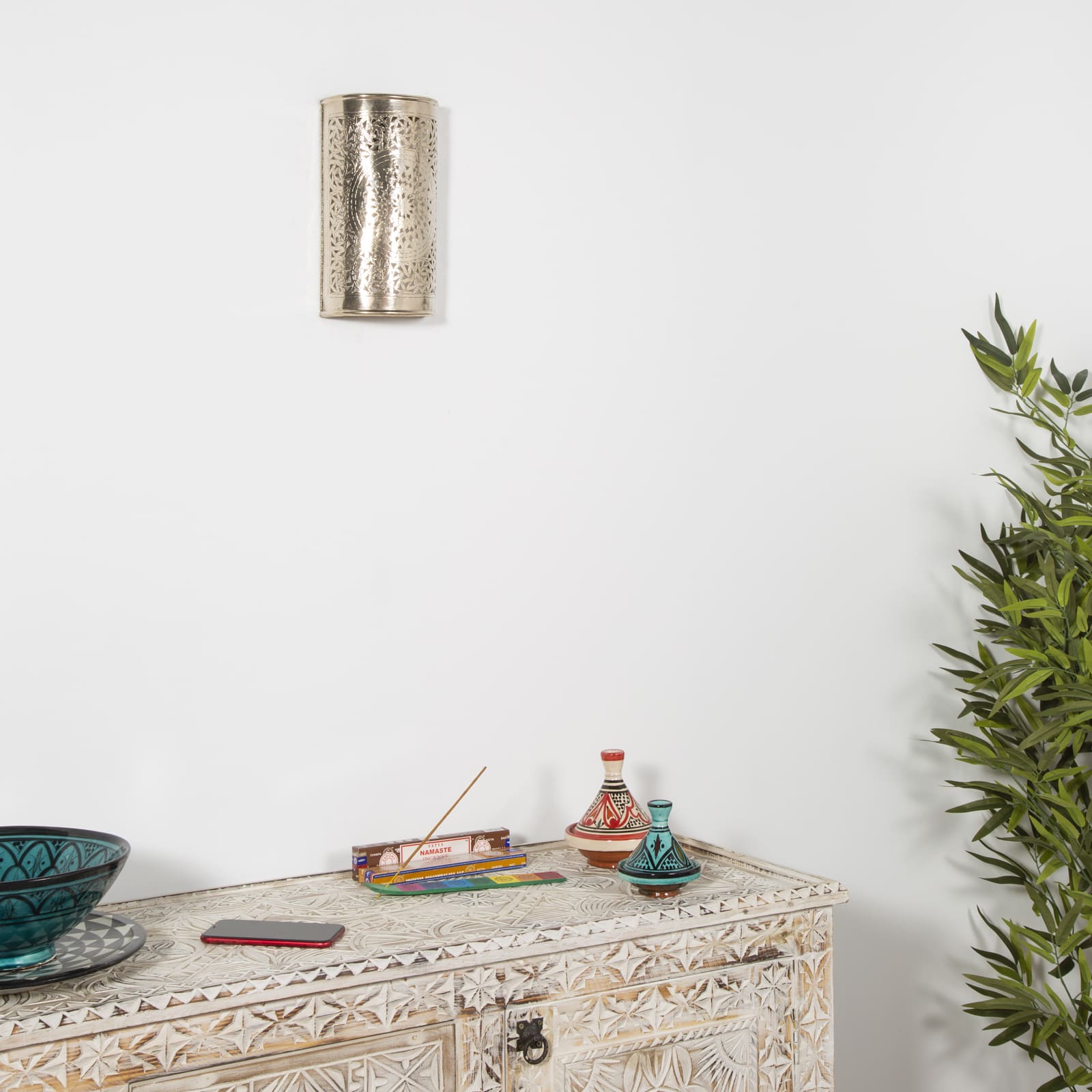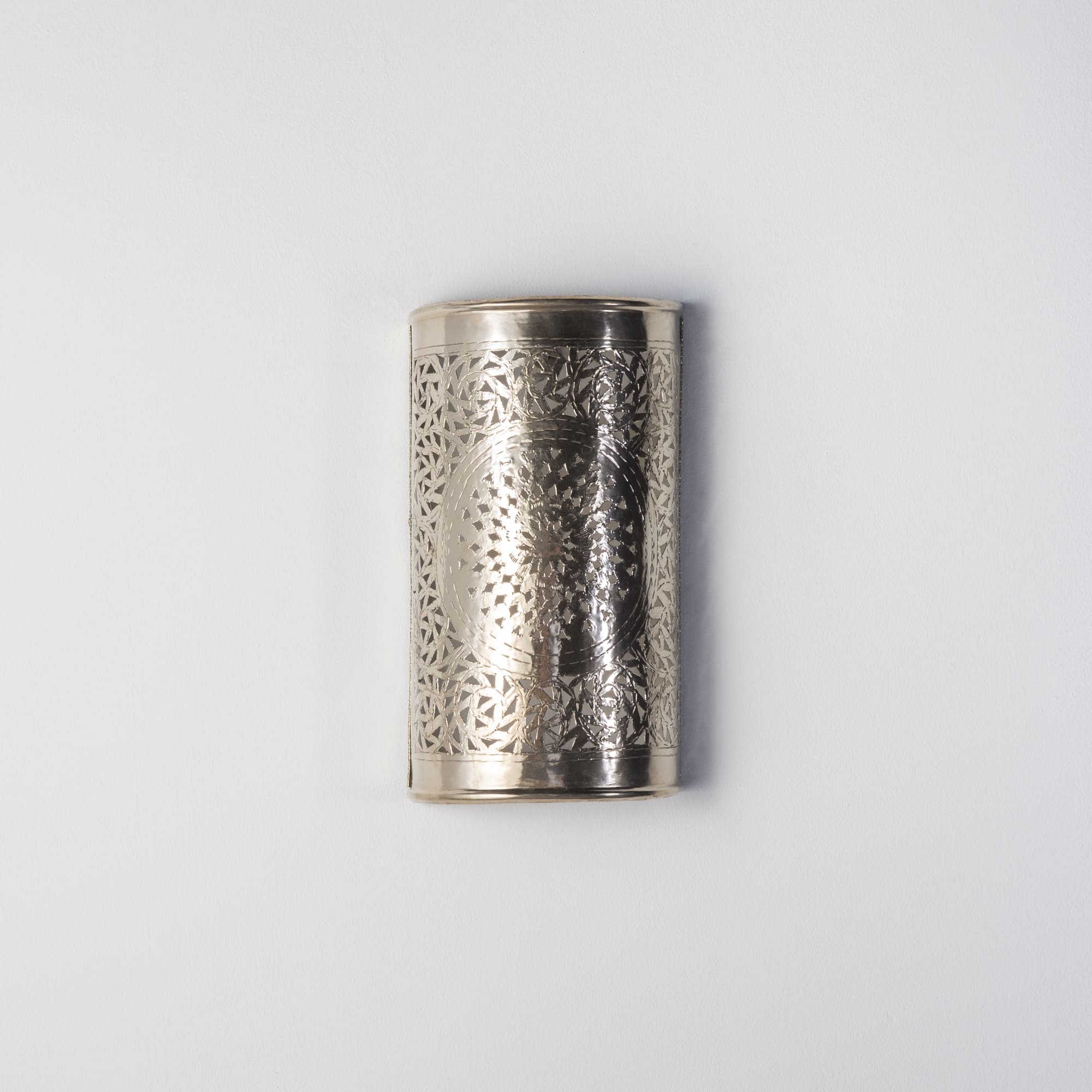 Aplique de parede marroquino em latão prateado com design de estrela. Esta peça 100% artesanal apresenta um trabalho vazado em latão com estrelas concêntricas. A cor prateada confere um estilo árabe moderno e vanguardista.
