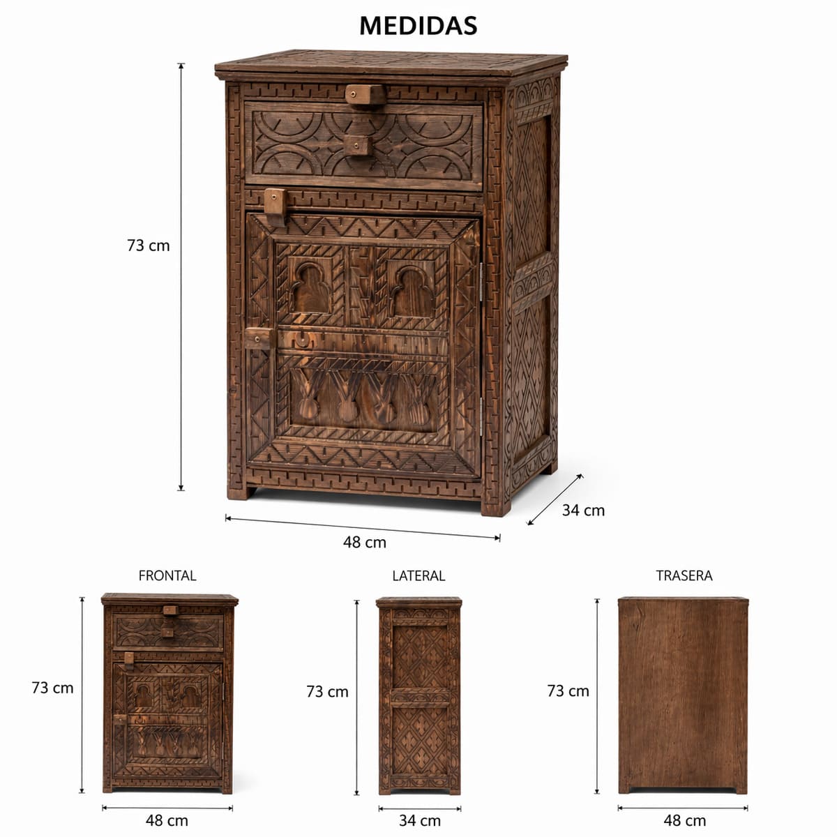 Ideal para dormitorios con estilo mediterráneo, árabe o bohemio, esta mesita combina funcionalidad y estética artesanal, elevando cualquier espacio con autenticidad y elegancia.