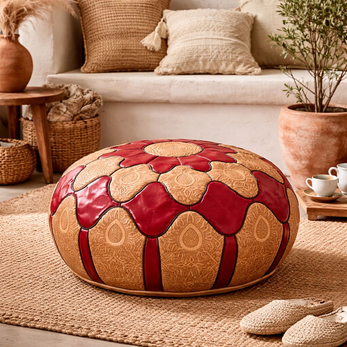 Elaborado en cuero natural y trabajado artesanalmente en Marruecos, combina tradición y funcionalidad en un formato versátil: úsalo como asiento auxiliar, reposapiés o elemento decorativo.